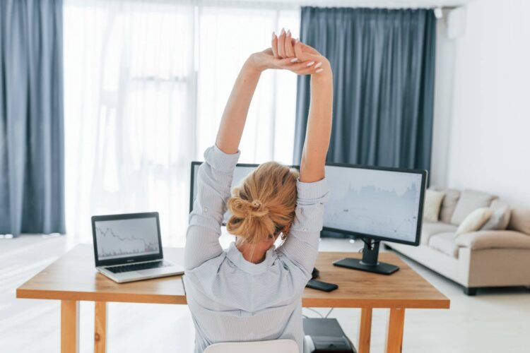 Затоа е важно да имате квалитетна канцелариска столица со потпирач за грб и да ја прилагодите на вашата висина. Доколку работите на лаптоп, се препорачува да користите држач за лаптоп и посебна тастатура. На овој начин можете да го подигнете екранот на соодветна висина и да избегнете свиткување напред.